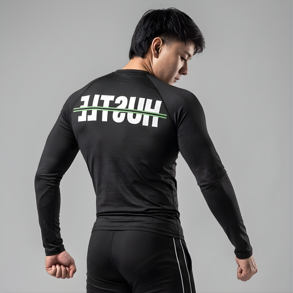Breathable and sweat-wicking, this torso compression keeps you cool and dry through high-intensity workouts. The bold HUSTLE back print adds a powerful athletic identity, making it perfect for athletes who train hard and stay focused.